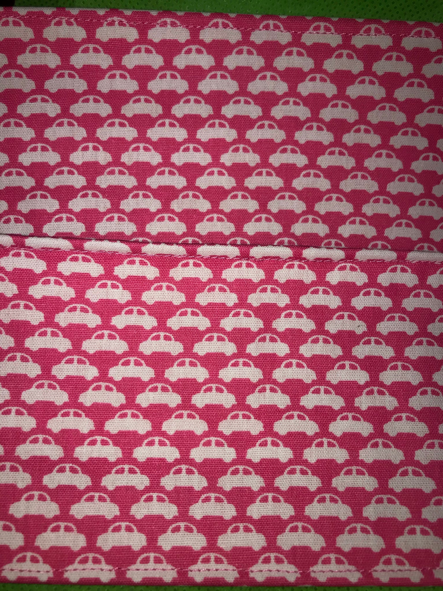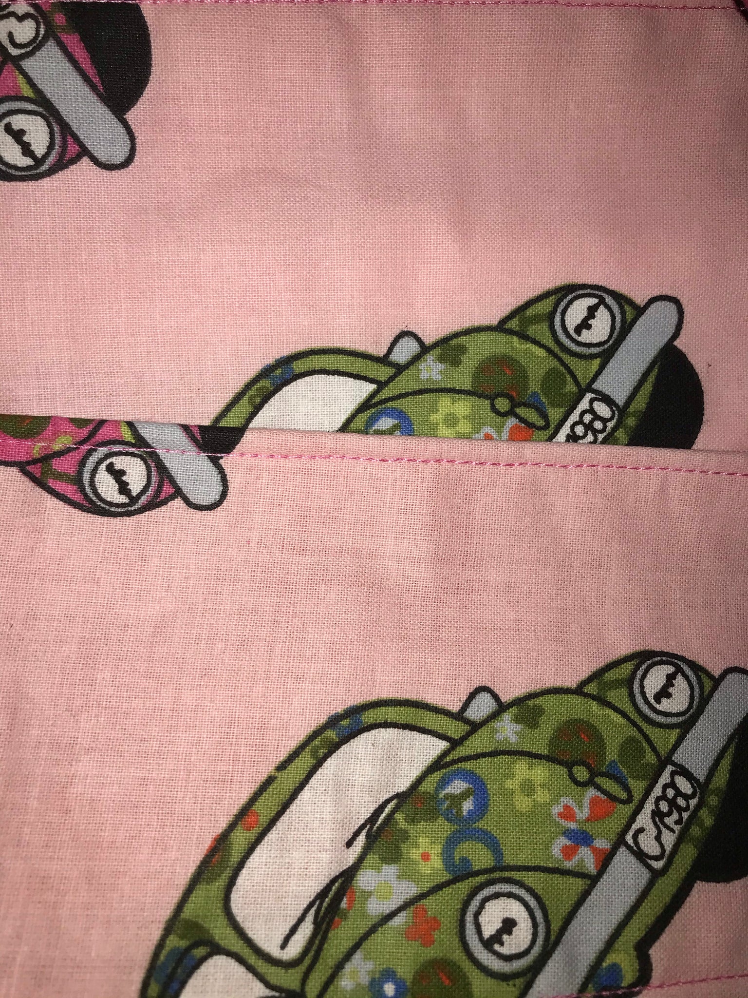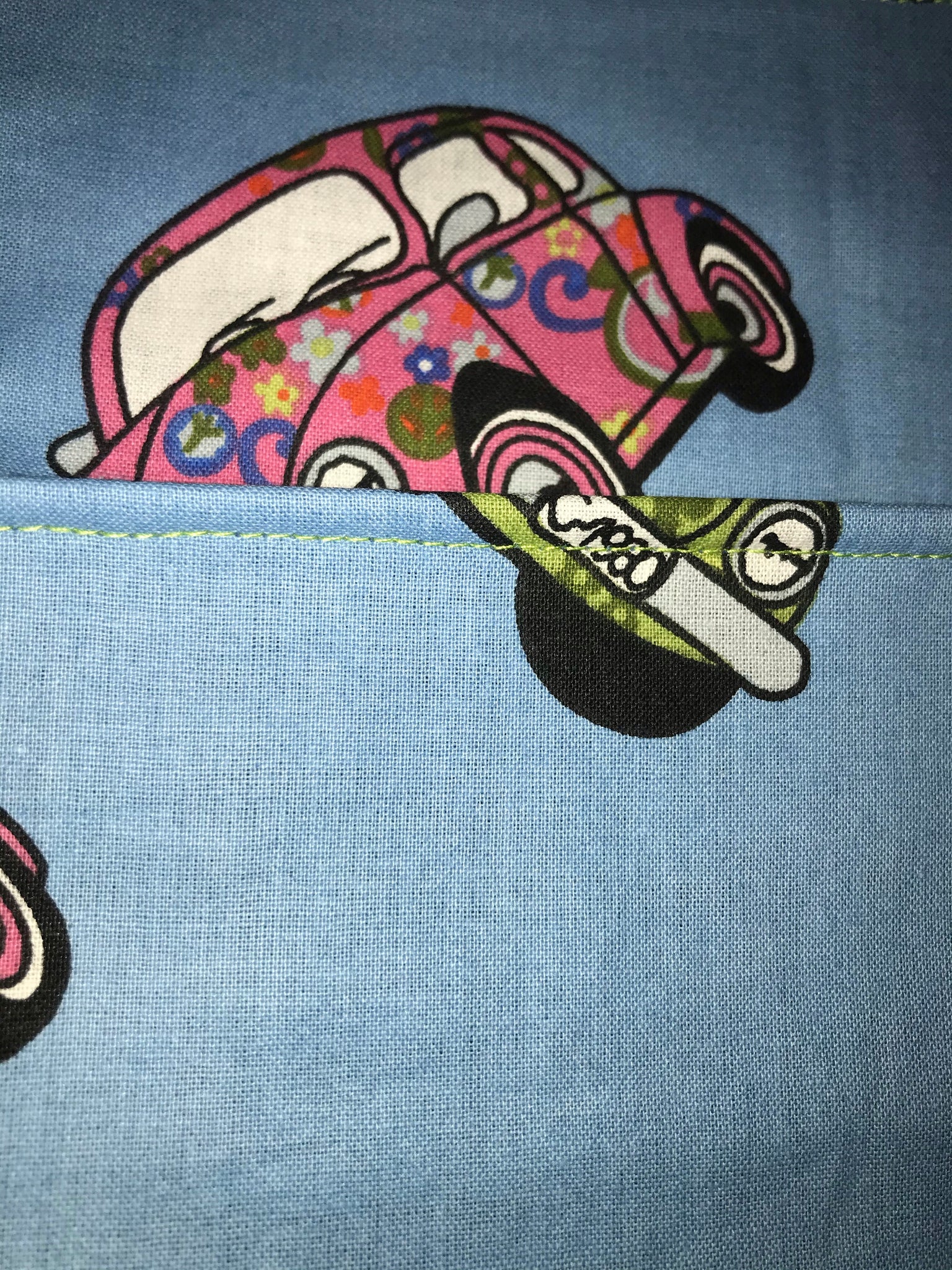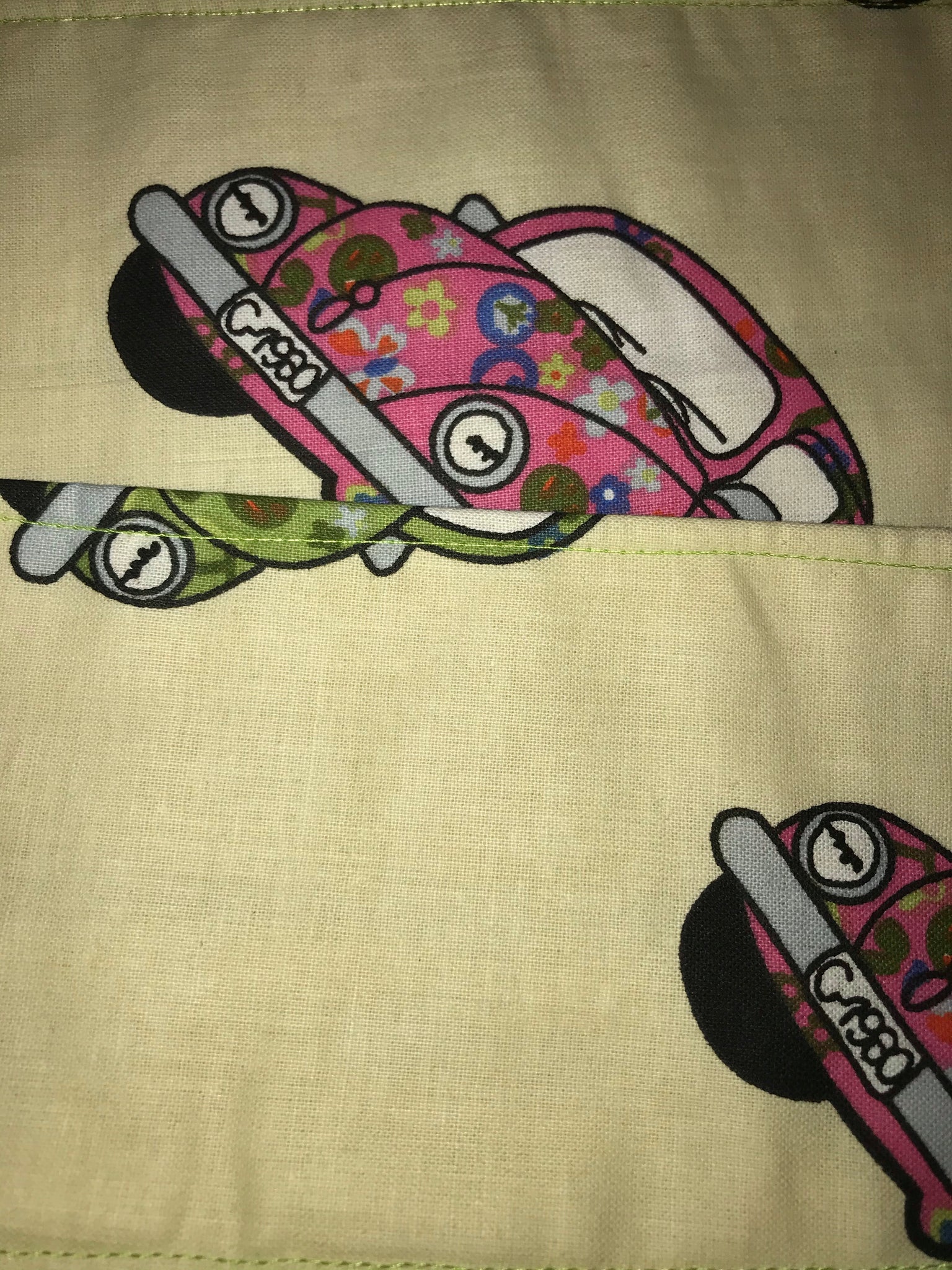 VW groovy bugs green and pink on blue, pink or ivory.